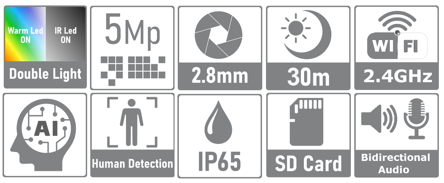 Telecamera di rete Bullet WiFi Obiettivo fisso 2,8 mm 5MP Doppio LED (IR e LED caldo)